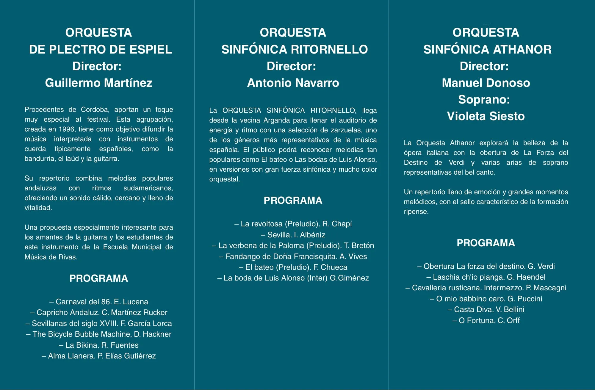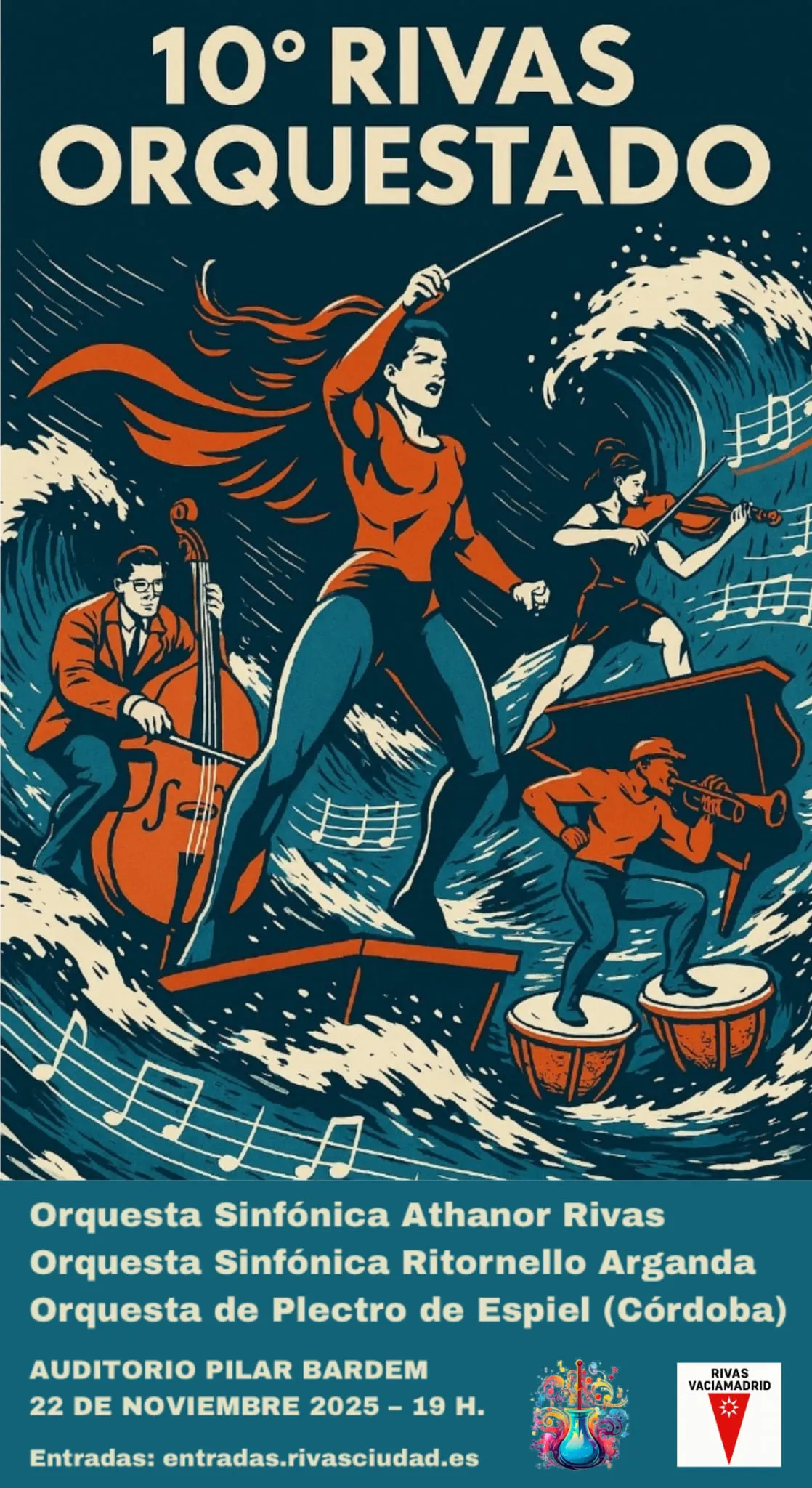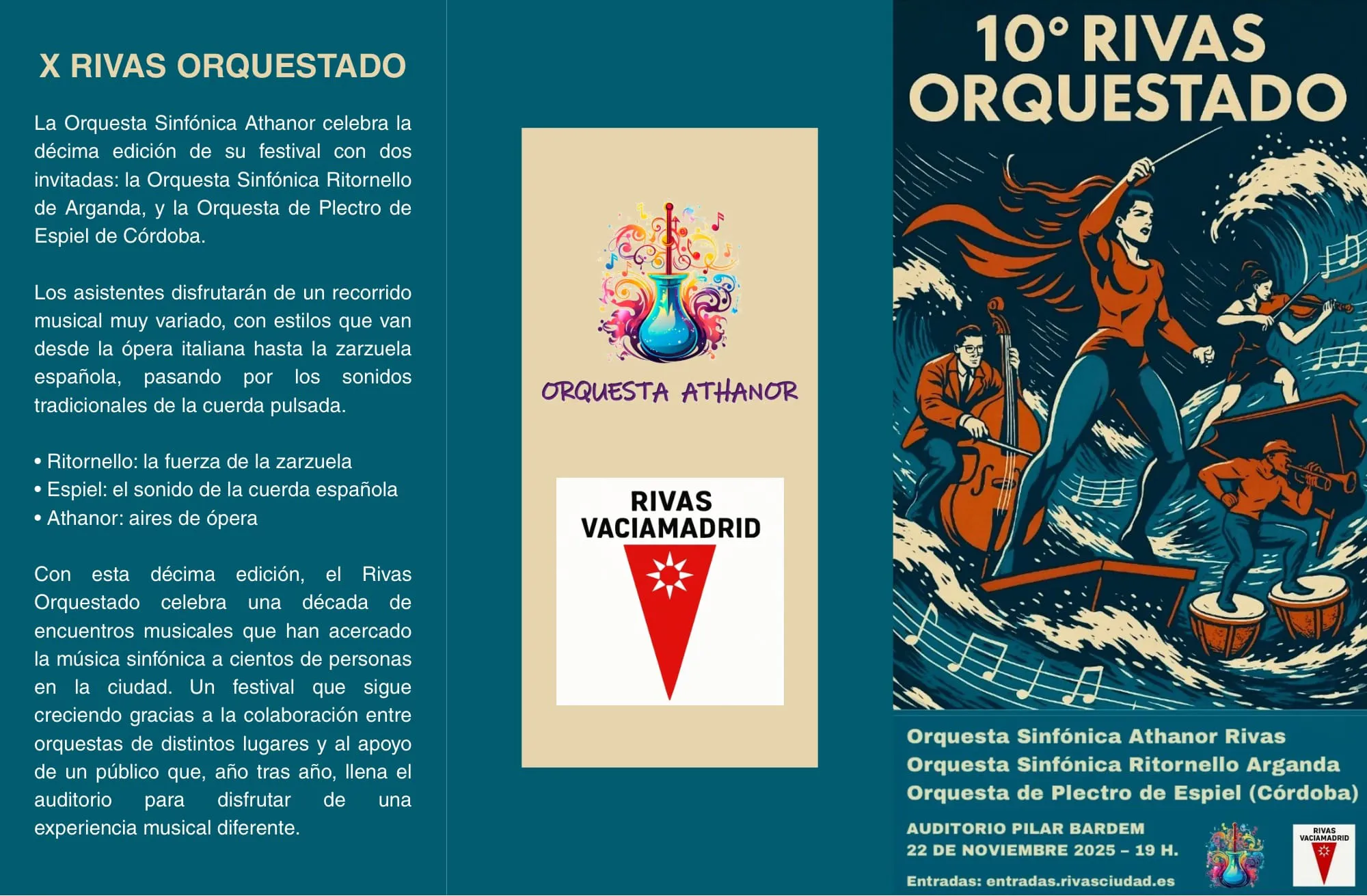 El sábado 22 de noviembre de 2026 participamos en la décima edición del Rivas Orquestado, un encuentro de orquestas sinfónicas organizado por la Orquesta Sinfónica Athanor de Rivas Vaciamadrid (Madrid). Fue el resultado del intercambio realizado con esta excelente orquesta ripense, que unos días antes viajó a Espiel para participar en nuestro XXIII Encuentro de Orquestas. Aquel 25 de octubre disfrutamos en Espiel de una noche de música maravillosa con la Orquesta Athanor y la soprano cordobesa María José Martínez.